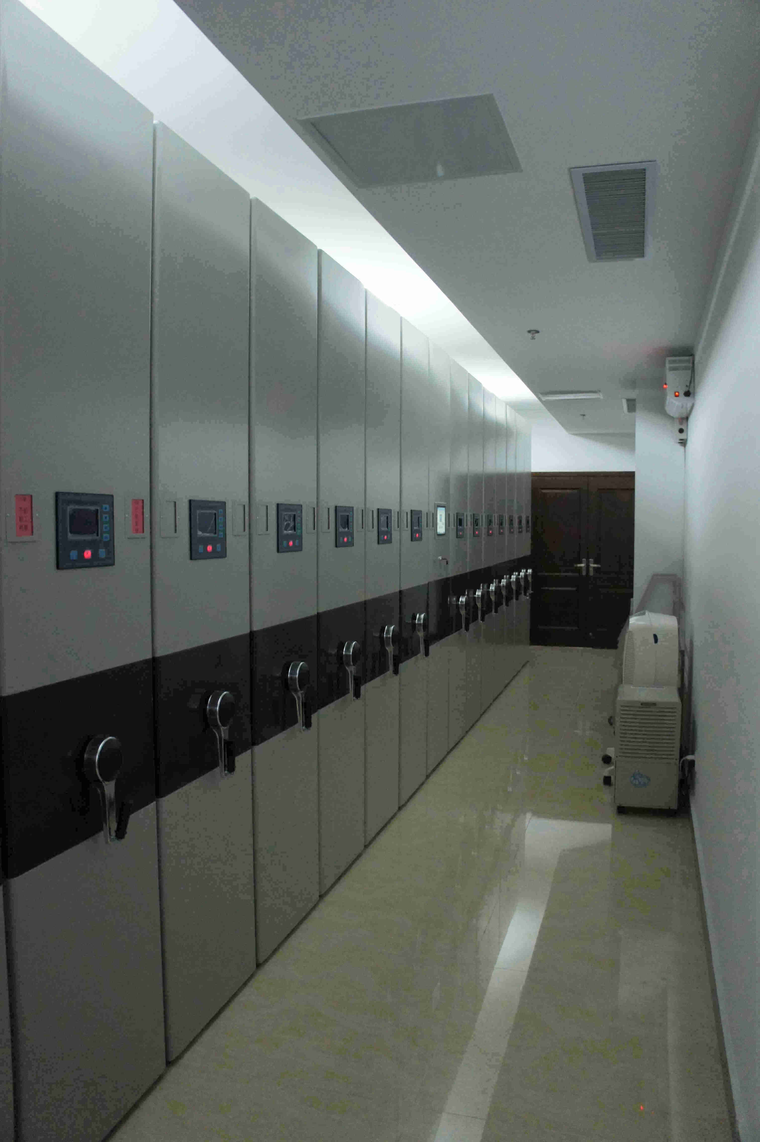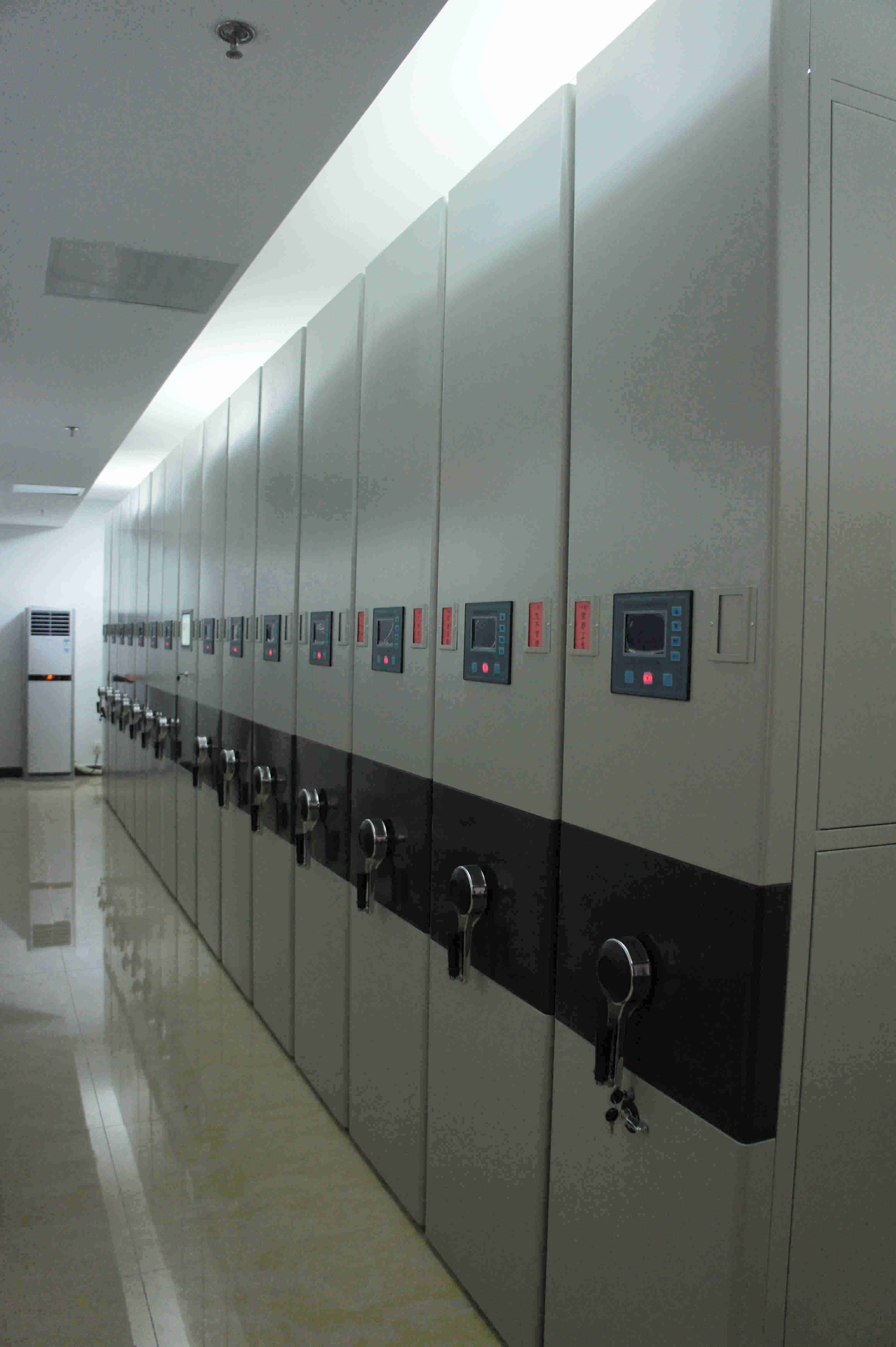 本次引進的智能密集柜檔案管理查詢系統(tǒng),由智能密集柜、智能溫濕度自動測控系統(tǒng)、智能臭氧消毒凈化系統(tǒng)、綜合智能控制終端和防磁柜等分部智能系統(tǒng)和設(shè)備組成。其中,主設(shè)備智能密集柜總?cè)萘?35立方米,共排設(shè)15列,每列6節(jié),共90節(jié)??扇菁{近20000余卷檔案資料歸檔存放,能滿足公司將來近30年檔案整理存放需求。特別值得一提的是,本次引進的智能密集柜較傳統(tǒng)密集柜增添了許多人性化設(shè)計功能,比如密集柜每列檔案架對應的倉位都獨立對應一個位置傳感器和指示燈,當有人員進入密集架內(nèi)部時,密集柜將停止進行移動。如此一來,既方便了資料查閱取放,又確保了工作人員的安全。溫控系統(tǒng)和消毒系統(tǒng)的配合使用,對檔案保存質(zhì)量的提升和保存年限延長起到有效的促進作用。智能控制終端是配合密集柜使用的檔案查詢管理系統(tǒng),可通過電腦直接控制密集柜開合并在電腦上查閱檔案資料內(nèi)容。