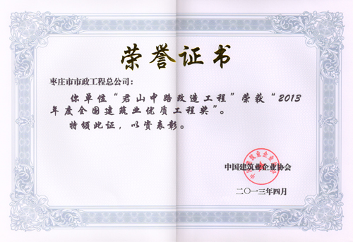 “君山中路改造工程”榮獲“2013年度全國建筑業(yè)優(yōu)質工程獎”