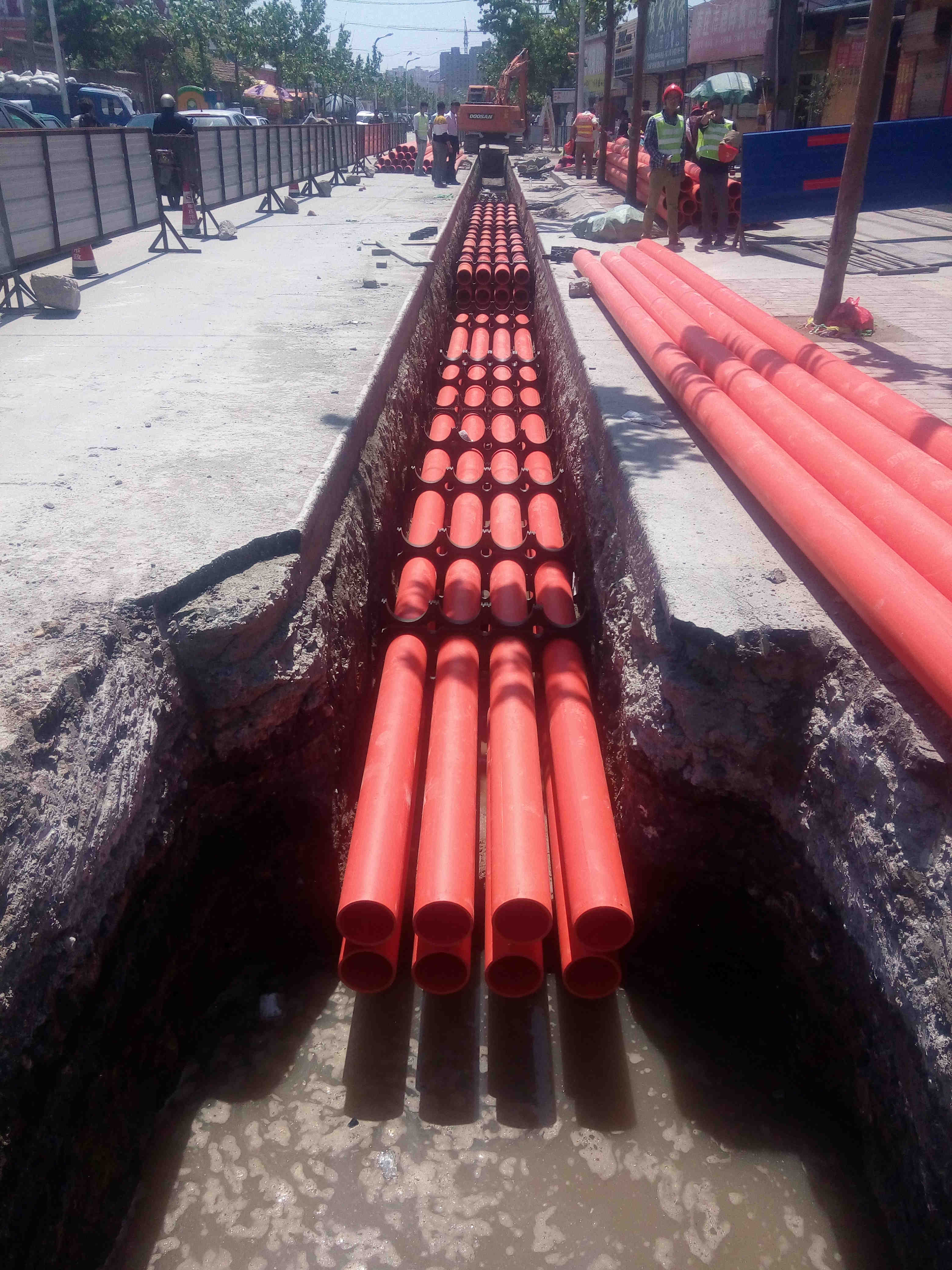 截止到目前電纜溝開挖已經(jīng)完成,開槽開挖已完成430米,管道安裝300米,包封310米,磚墻檢查井砌筑6座。目前供電排管安裝正加緊施工,火速推進(jìn)。在緊張施工的同時(shí),項(xiàng)目部更把安全質(zhì)量放在首位,堅(jiān)強(qiáng)圍擋、警示燈安全文明施工措施,給附近居民出行保駕護(hù)航。