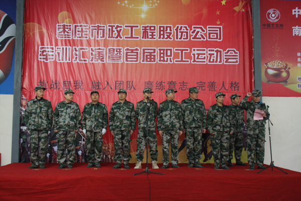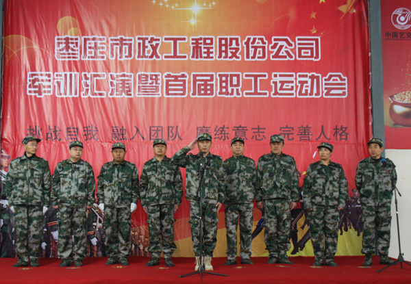 軍演結(jié)束后,舉行了簡短的棗莊市政工程股份公司首屆職工運動會開幕式。開幕式上裁判員代表和運動員代表分別上臺宣誓,趙峰董事長宣布了首屆運動會開幕。開幕式結(jié)束后,全體參訓人員及軍訓教官合影留念。